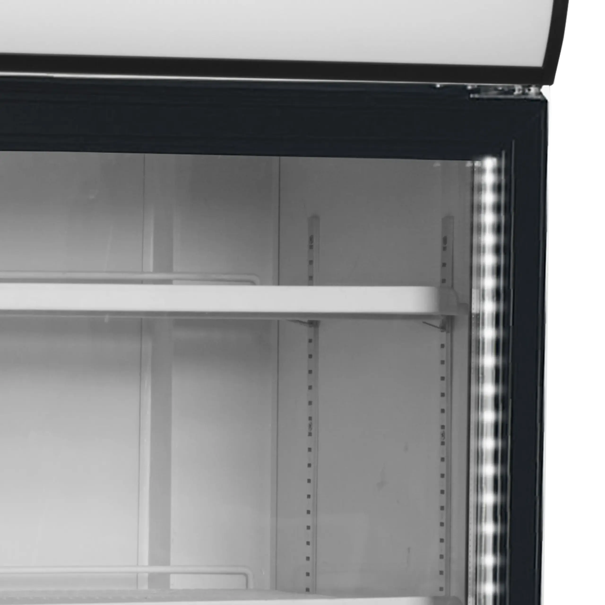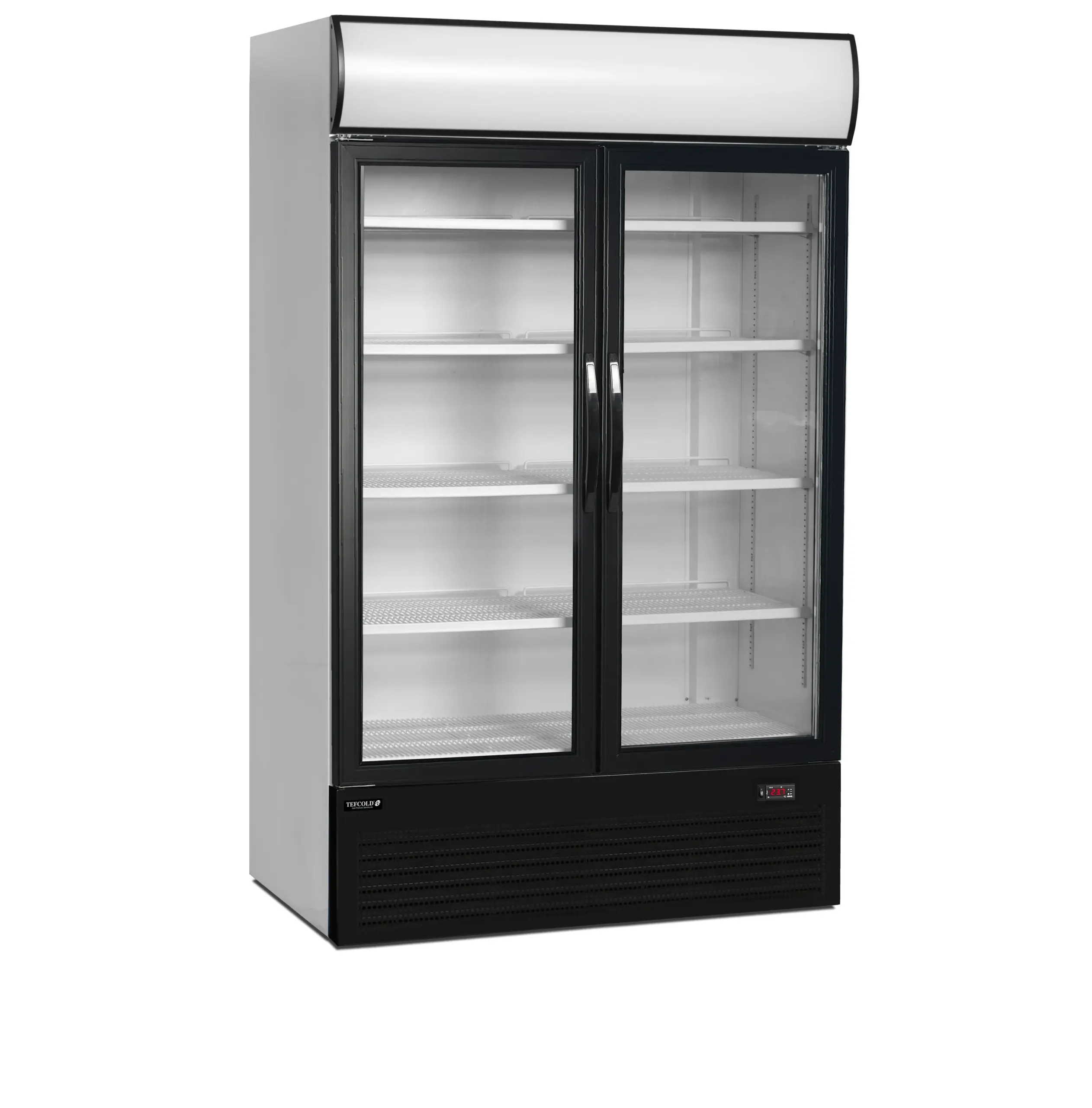 Expositor refrigerado de 2 puertas con display de iluminación. Es estándar con exterior e interior blancos. Incluye 5 estantes de rejilla blancos ajustables, 2 puertas de cristal batientes de cierre automático, 2 luces LED en toda la longitud de la parte interior del marco de la puerta y una marquesina de iluminación LED.