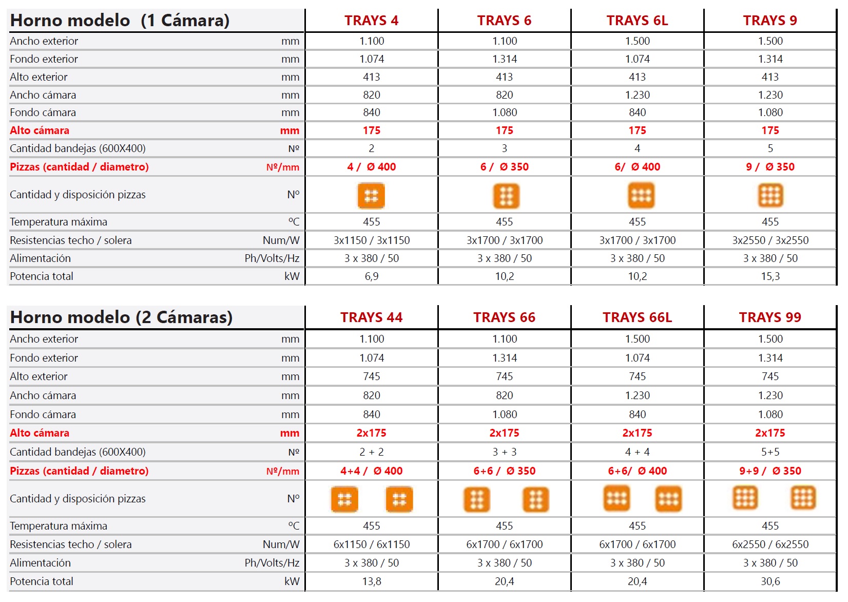 Los hornos de la línea Trays representan lo máximo en flexibilidad, permitiendo de dos a diez bandejas cm 40×60. Permite cocciones excelentes mediante calibrando por separado de dos temperaturas de trabajo superior e inferior, con valores que llegan a 455°C. Las características técnicas los hacen una solución a las necesidades y exigencias para los clientes que desean un producto multiuso.