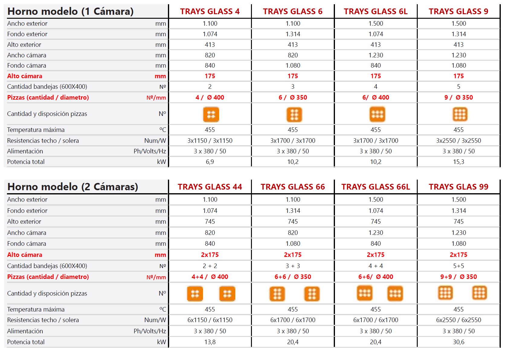 Los hornos Trays Glass representan lo máximo en flexibilidad, permitiendo de dos a diez bandejas cm 40×60. Permite cocciones excelentes mediante calibrado por separado de dos temperaturas de trabajo distintas superior como inferior, con valores que llegan a 455°C. Las características técnicas los hacen una solución a las necesidades y exigencias para los clientes que desean un producto multiuso.