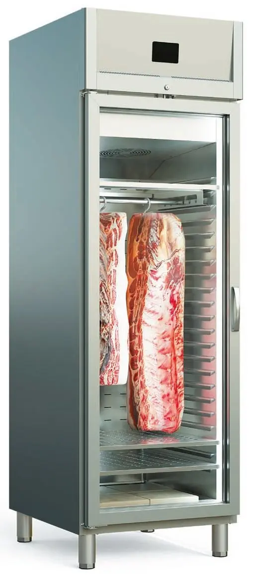 Armarios expositores con temperatura de trabajo dentro del rango -2°+8°C y humedad entre 40% y 90% (sin aporte exterior de agua). Garantizan el control y la seguridad del proceso de envejecimiento de la carne (maduración), con la posibilidad de monitorizar de forma remota o in situ el funcionamiento y ajustes de los equipos, gracias al avanzado sistema de control que incorporan.