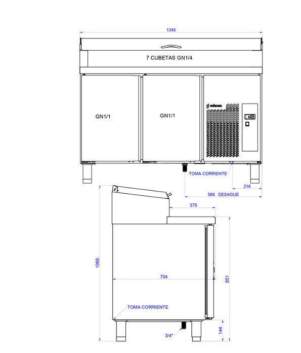 • Contenedor neutro incorporado en la encimera para colocar los ingredientes mediante cubetas de GN 1/3 de profundidad 150 mm o de GN 1/4 de profundidad 150 mm (no incluidas en dotación), dependiendo