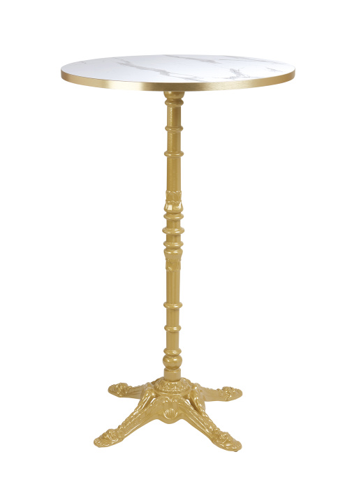 Mesa Alta de estilo Clásico o vintage, con detalles ornamentales que recuerdan al diseño del siglo XIX o principios del siglo XX. Este tipo de pie es típico de mesas de café estilo parisino o bistró, muy comunes en cafeterías con decoración clásica o retro