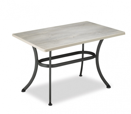Mesa Rectangular con patas arqueadas curvas. Buena estabilidad gracias al refuerzo central. Ofrece una estética atractiva y estilo clásico/industrial. Más espacio para las piernas en comparación con algunas mesas de cuatro patas rectas.