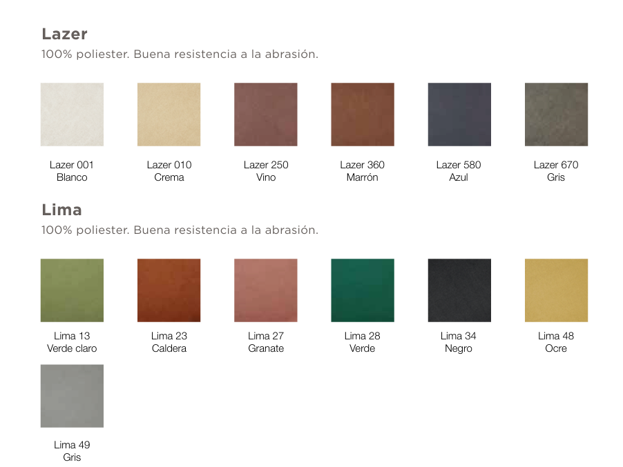 • Asiento y respaldo: Tapizado a elegir: Lazer / Lima – Bering / Corda – Kubiks ( Indicar en cada caso el acabado)