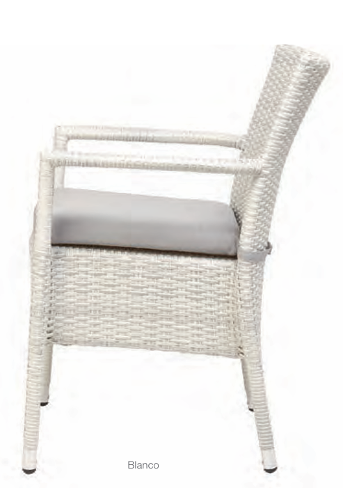 Armazón: Tubo de aluminio. Asiento y respaldo: Recubiertos con médula sintética 100% virgen, no reciclada, tejida a mano. Incluye cojín.