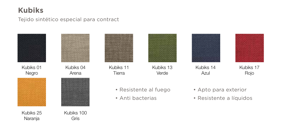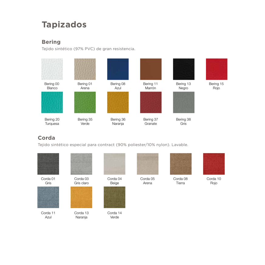 • Asiento y respaldo: Tapizado a elegir: Lazer / Lima – Bering / Corda – Kubiks ( Indicar en cada caso el acabado)