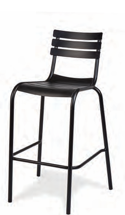 Taburete negro en aluminio. Diseñado para uso en exteriores e interiores, este taburete es apilable y combina resistencia y durabilidad con la posibilidad de ahorrar espacio al apilarlas