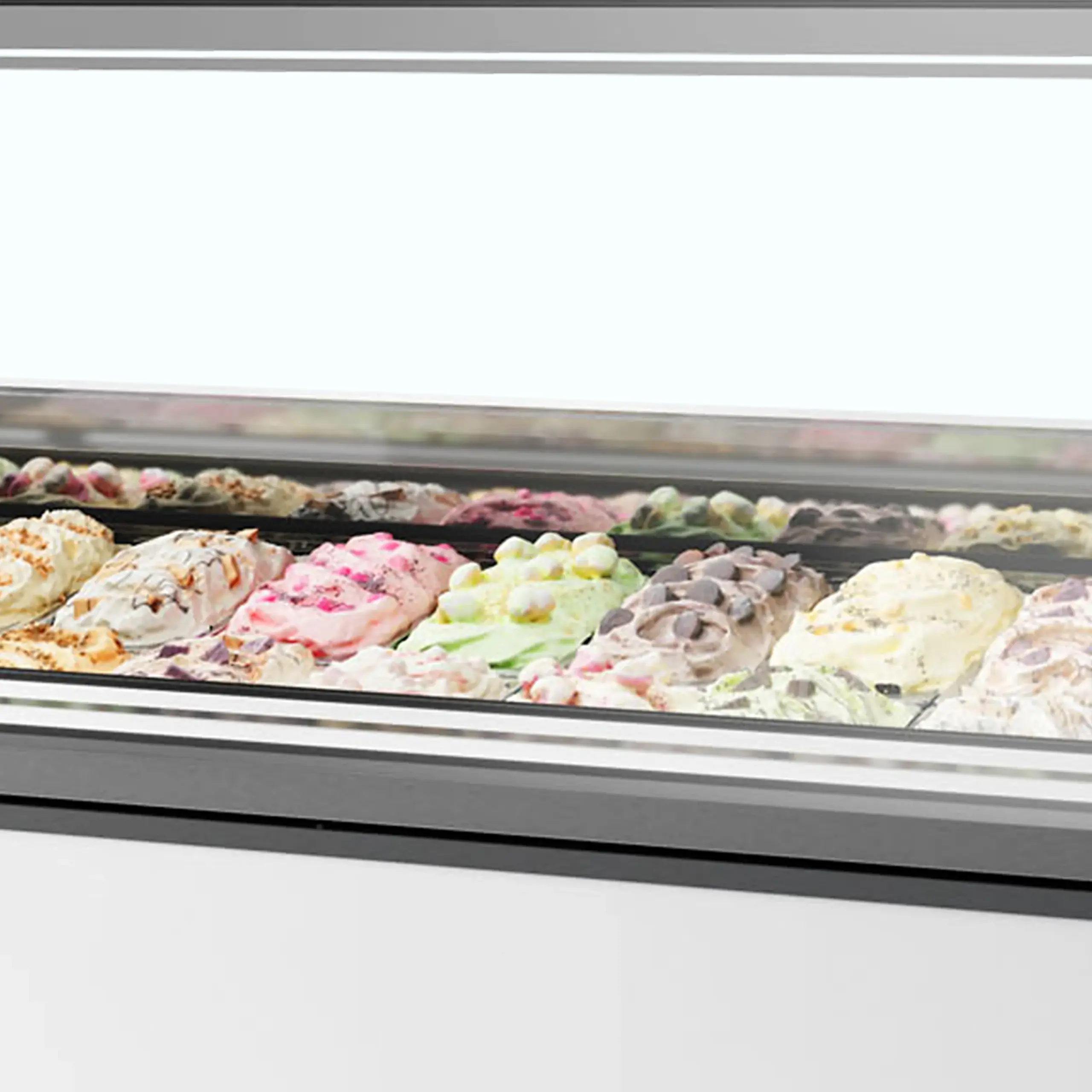 Vitrina de alta gama que ofrece amplio espacio para mostrar una gran variedad de deliciosos sabores. La moderna pantalla de cristal plano proporciona una impresionante presentación visual, mientras que el sistema de refrigeración asistido por ventilador garantiza que tu helado se mantenga a la temperatura perfecta.